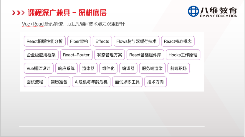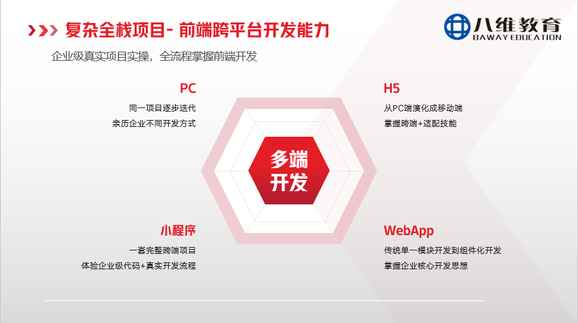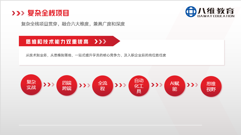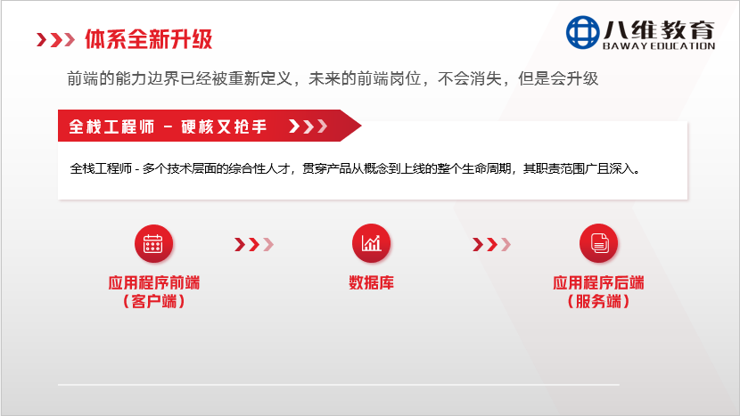 无论环境如何变化,前端高级工程师始终是各大公司争抢的核心人才。八维大学生短训将致力于全方位打造“技术成长和职业破局”的双高体系,深度打通“全栈+全流程+多端+工程化+AI赋能”,全面培养能够“驾驭全局、深广兼备,打通多端全栈”的高级工程师,将每位学员锻造成企业竞相追逐的稀缺性人才。