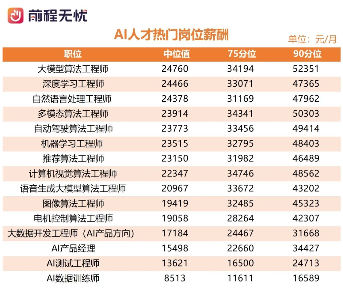 前程无忧发布《2026届校招市场AI人才需求报告》显示,大模型浪潮下,AI技术研发类岗位薪酬中位值较高。前程无忧人力资源调研中心的数据显示:大模型算法工程师以24760元/月的中位薪酬领跑,多模态算法工程师、自动驾驶算法工程师、机器学习工程师、推荐算法工程师薪酬中位值均超过23000元/月;支持性岗位如AI测试工程师(13621元/月)和AI数据训练师(8513元/月)薪资排名紧随其后。