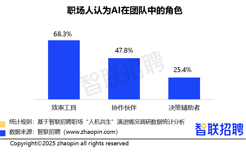 智联招聘最新调研显示,高达78.2%的职场人每周都会借助AI开展工作,71.7%的受访者认可AI对工作效能的提升作用。AI已能替代文档校对、数据录入、基础报表生成等重复性工作,将人从“机械劳动”中解放出来。