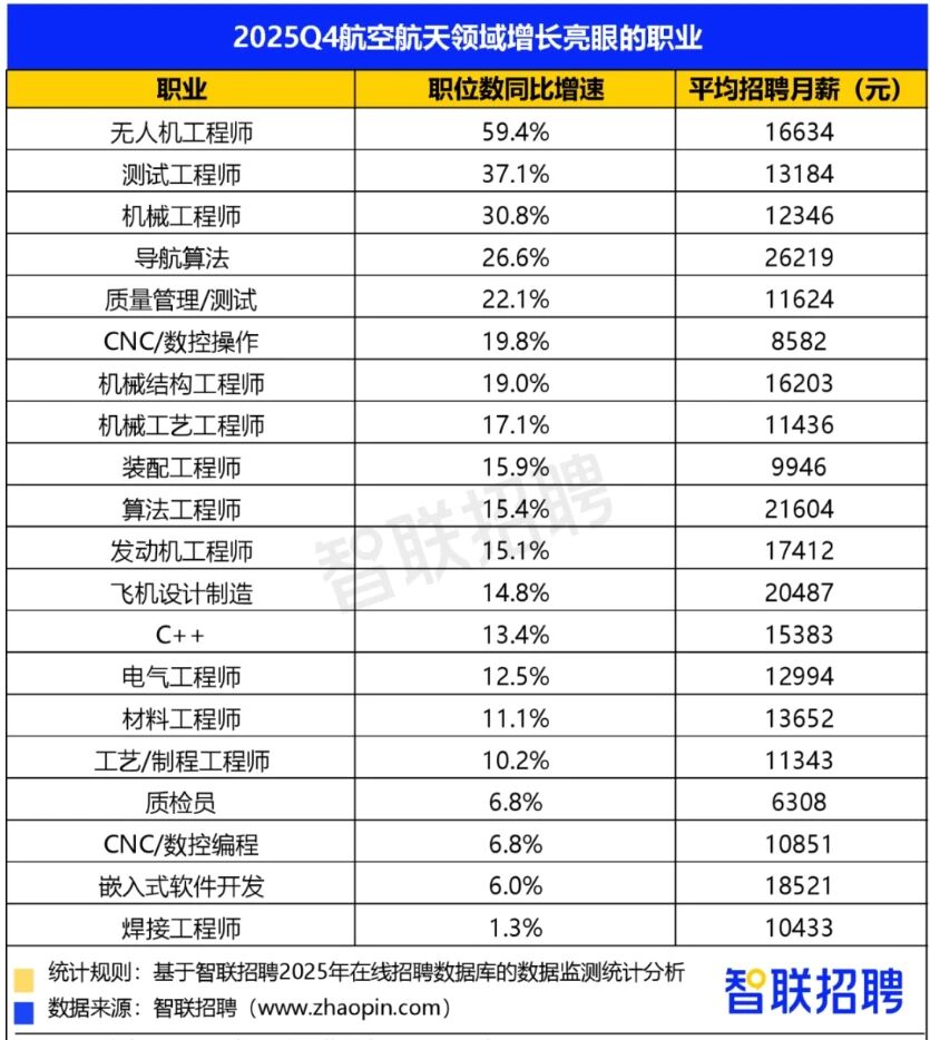 嵌入式软件开发领域中,C/C++、Python、Java成热门技能;航空航天领域,行业在航空装备迭代以及低空经济推进的共同影响下,对研发、制造与算法类岗位的需求较为集中。