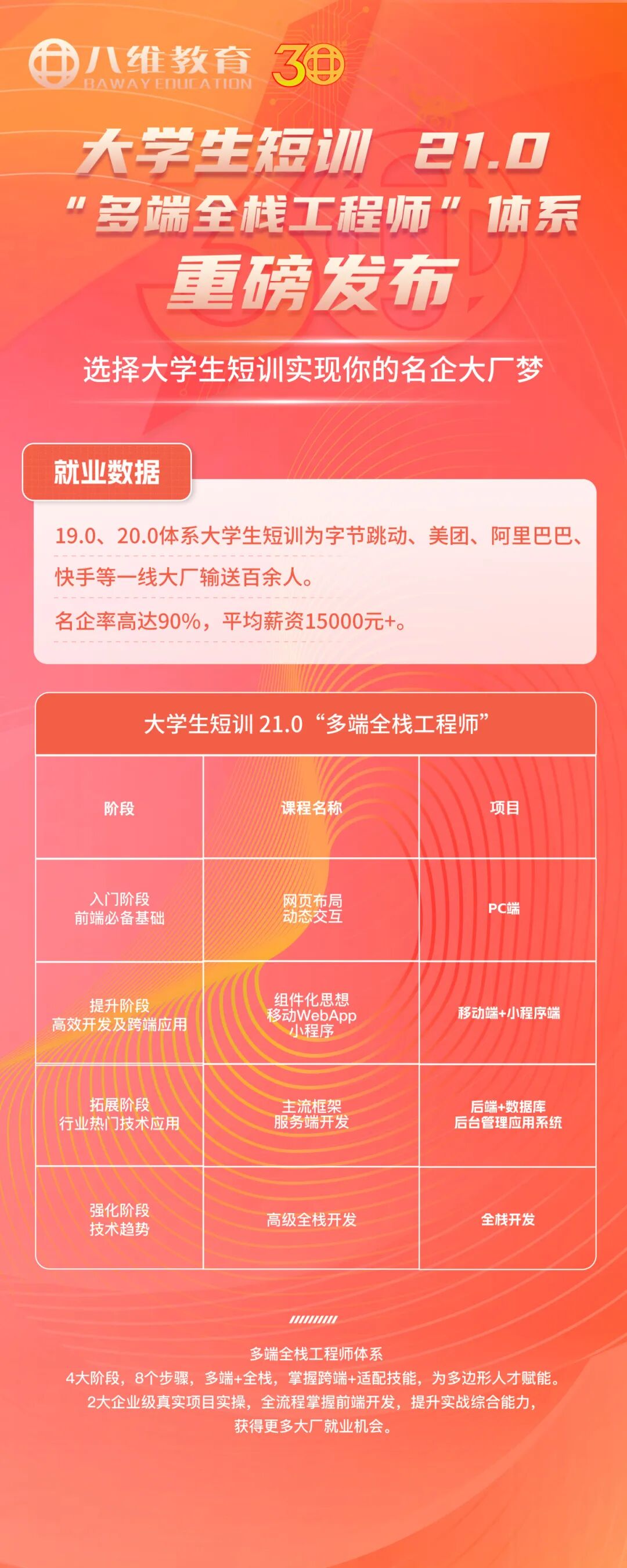 就业数据:全栈开发专业应届生就业率 92%+,平均起薪 15K / 月,头部学员入职大厂起薪 22K+