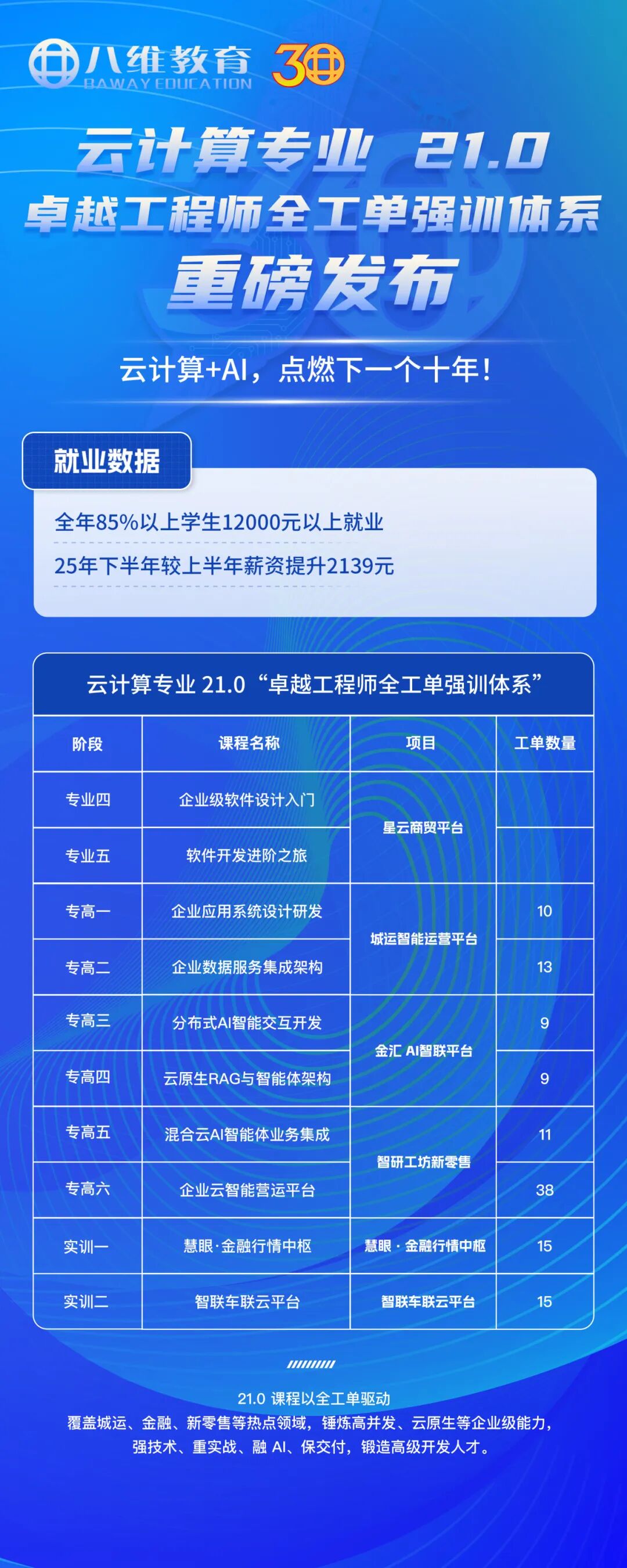 就业数据:八维云计算 + AI 方向毕业生就业率 93%+,平均起薪 18K / 月,头部学员入职大厂起薪 28K+,就业方向覆盖互联网、智能制造、金融、政务等多个领域