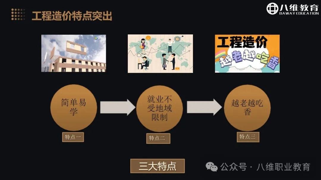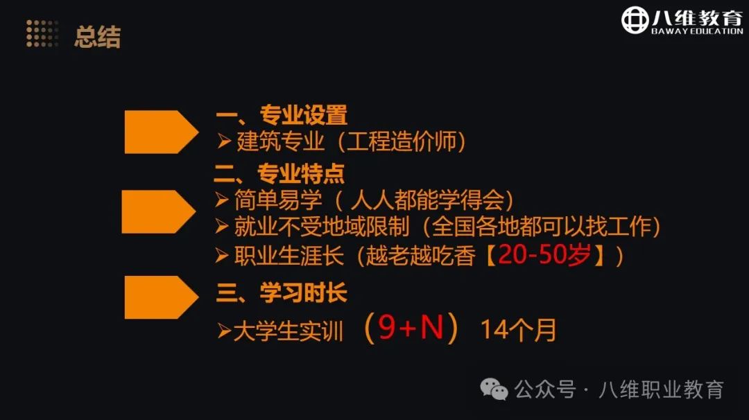 越老越吃香:建筑专业工程造价岗位不受年龄限制,随着从业经验的增加,职业的就业壁垒逐渐增加,核心竞争力自然变强。八维教育学校建筑专业以独特的教育教学模式结合八维创新教育理念,不断升级迭代工程造价专业课程,降低学习门槛;通过实训项目拔高学生专业技术壁垒,形成核心竞争力。