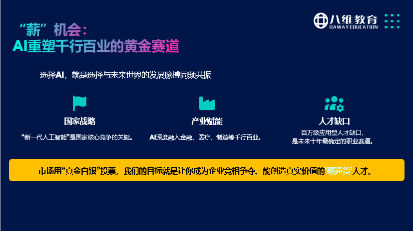 八维教育的AI入门培训,针对不同基础的学习者设计课程,帮助零基础学员掌握AI工具的使用逻辑,具备用AI解决实际问题的能力;对于有基础的从业者,课程可深化其对AI技术底层逻辑的理解,提升技术适配和创新能力。例如,传统行业的职场人通过课程学习,能掌握AI文案生成、数据可视化工具,提升工作效率;高校学生可提前接触工业智能体、大模型应用等前沿内容,增强就业竞争力。