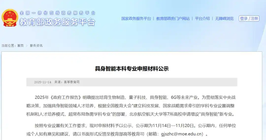 全国教育大会进一步提出,“建立科技发展、国家战略需求牵引的学科专业设置调整机制和人才培养模式,超常布局急需学科专业”的部署,为响应国家战略,北京航空航天大学等7所高校申请增设“具身智能”新专业。