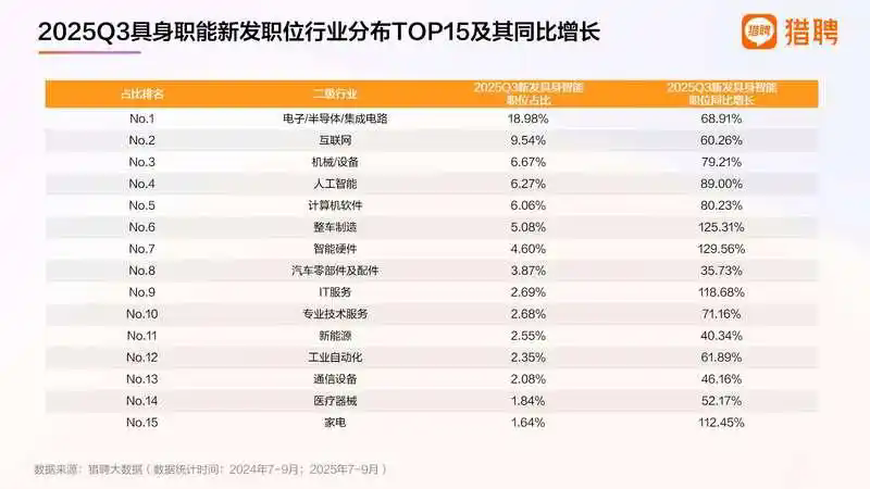 猎聘近日发布的《2025三季度人才供需洞察报告》显示,今年三季度,具身智能领域新发职位同比增长72.86%,增速超过人工智能行业(54.84%);平均招聘年薪达33.34万元,高于人工智能行业的29.09万元,薪资更具竞争力。