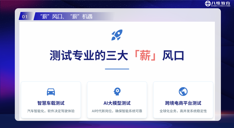 随着智慧车载、AI大模型、跨境电商等领域的高速发展,市场对兼具开发与测试技能的测试开发工程师需求激增。八维21.0课程体系源自一线大厂的真实经验,能帮助学生精准切入高价值、高成长性的风口岗位,从技术小白成长为企业的核心力量。