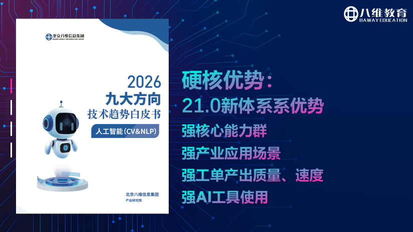当 6G 布局全面启动、AI + 赋能千行百业、数据成为核心生产要素,互联网行业的黄金机遇期已至。选择八维教育,就是选择与行业热点同频、与高薪岗位对接、与未来发展同行。在这里,你将习得前沿技术、积累实战经验、收获优质人脉,从零基础小白蜕变为企业争抢的技术人才!