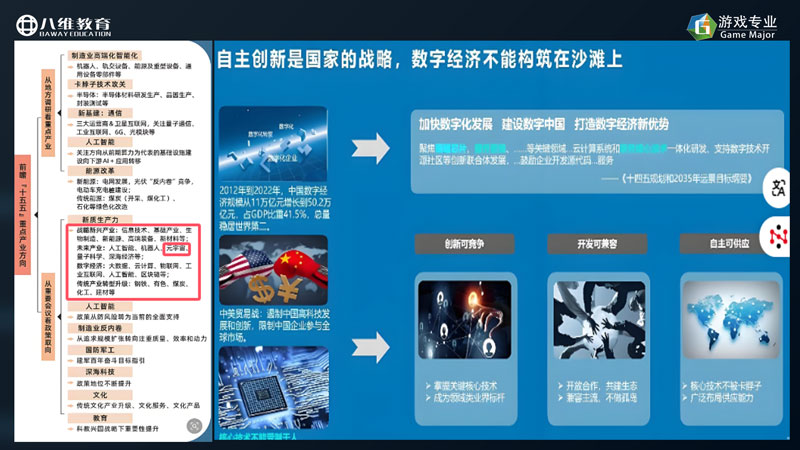 八维教育游戏专业紧密贴合国家“新质生产力”战略,前瞻性视角锁定前沿科技,与时代趋势同频共振;紧扣以鸿蒙生态、元宇宙技术为核心的新领域,覆盖座舱系统开发、数字孪生、工业仿真等国家战略重点方向。