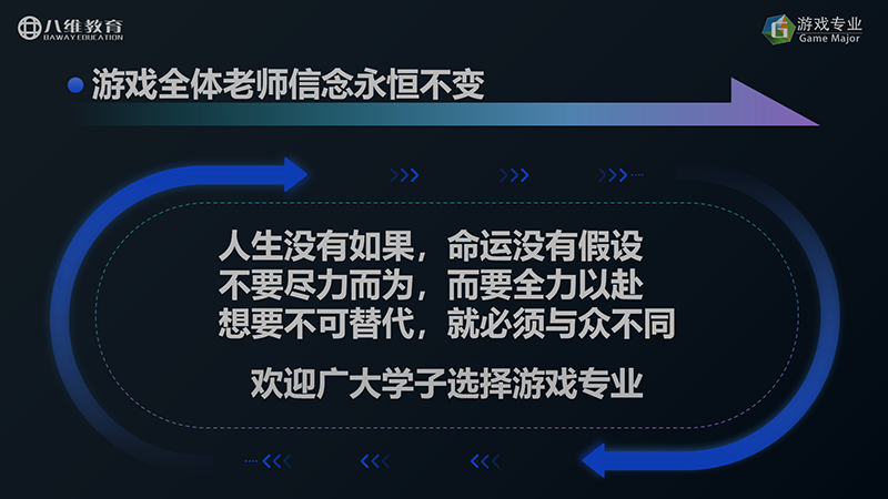八维教育游戏专业秉持“人生没有如果,命运没有假设。不要尽力而为,而要全力以赴,要想不可替代,就要与众不同”的格言,这正是数字时代的生存法则: