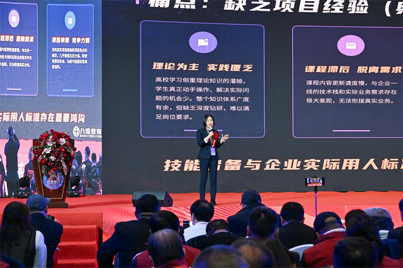 集团大学生短训产品负责人赵晓茹一针见血地指出了当前“大学生就业难”的核心痛点:传统高校教育与企业真实需求之间存在巨大的能力鸿沟。八维大学生短期精英班坚持以结果为导向,以名企大厂为目标,围绕“知识储备、工程思维、实战经验与成长潜力”四大关键能力,构建学生竞争力的“护城河”,助力他们在短期内实现从理论到实战的能力跃迁。