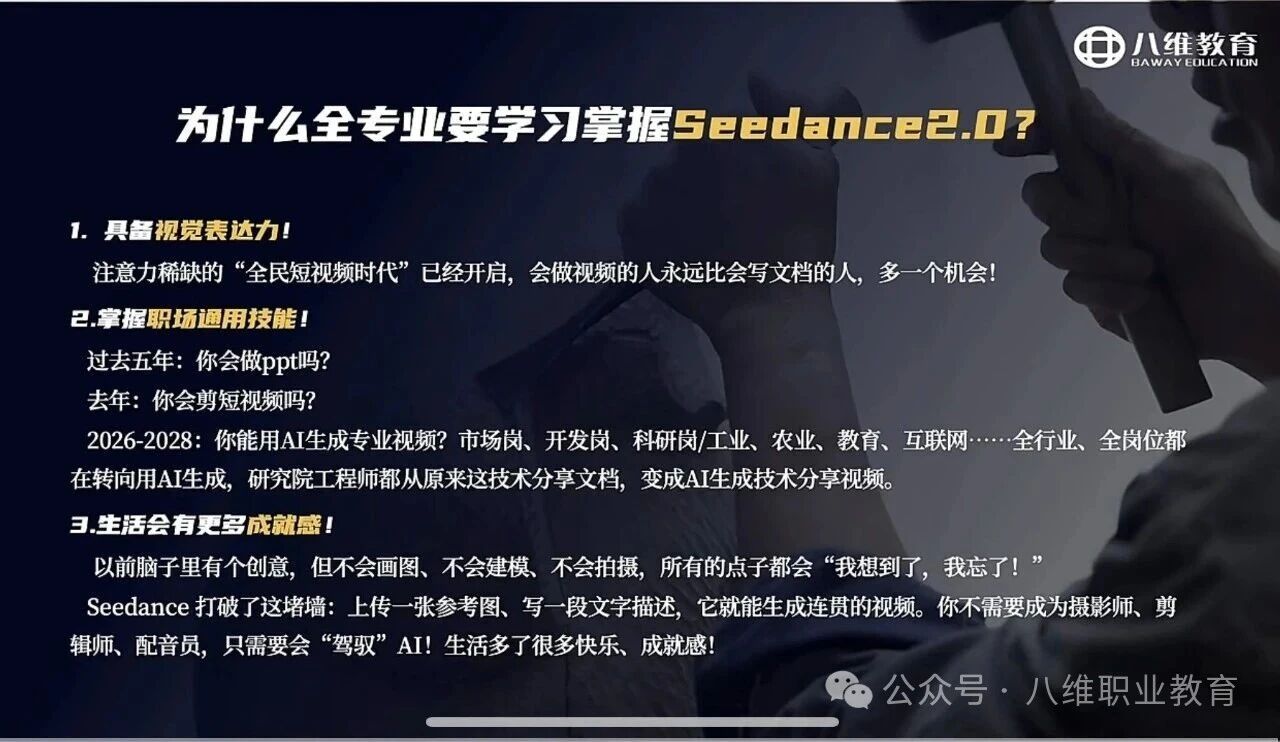 ★本课程具备高度稀缺性:单独学Seedance 2.0,线上训练营动辄两三千,且只能教基础出图;“AI小龙虾伴读”的高级工作流(脚本+分支剧情+角色一致性),市面上几乎没有系统课程;漫剧+游戏视频双线并行,仅八维提供完整课时与实战指导!